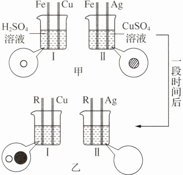 (2)为了探究 Fe、Cu、Ag、R(R 为未知金属)四种金属的活动性顺序,进行如下实验:如图甲所示,将四根金属丝同时插入盛有溶液的烧杯中,观察到I中铁丝表面出现气泡,Ⅱ中铁丝表面有红色物质生成;如图乙所示,一段时间后,将烧杯中铁丝替换为 R 丝进行实验,观察到I中 R 丝表面出现气泡,Ⅱ中 R 丝表面无明显现象。“○”“●”“●”为相应金属丝插入烧杯前,烧杯中溶液内存在的阳离子。