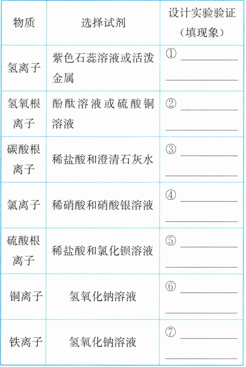 答案:6. ①紫色石蕊溶液变红色或有气泡产生 ②酚酞溶液变红色或有蓝色沉淀生成 ③有气泡生成且澄清石灰水变浑浊 ④产生白色沉淀 ⑤产生白色沉淀 ⑥产生蓝色沉淀 ⑦产生红褐色沉淀