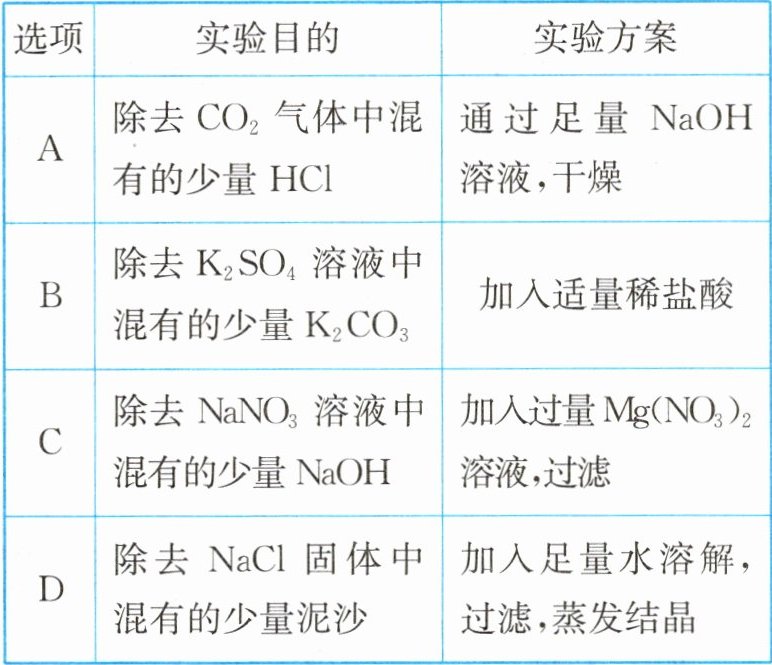 答案:10. D 解析:CO₂和HCl气体均能与NaOH溶液反应,不但能把杂质除去,也会把原物质除去,不符合除杂原则,故A不符合题意;K₂CO₃能与适量稀盐酸反应生成氯化钾、水和二氧化碳,能除去杂质但引入了新的杂质氯化钾,不符合除杂原则,故B不符合题意;NaOH能与Mg(NO₃)₂溶液反应生成氢氧化镁沉淀和硝酸钠,能除去杂质但引入新的杂质硝酸镁(过量的),不符合除杂原则,故C不符合题意;氯化钠易溶于水,泥沙难溶于水,可采取加足量水溶解、过滤,蒸发结晶的方法进行分离除杂,故D符合题意。