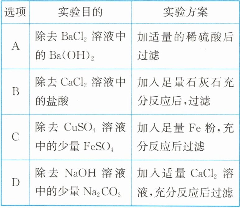 答案:11. B 解析:硫酸与氯化钡和氢氧化钡都能反应,会把原物质除去,不符合除杂原则,故A错误;盐酸能与足量石灰石反应生成氯化钙、水和二氧化碳,再过滤除去过量的石灰石(难溶于水),能除去杂质且没有引入新的杂质,符合除杂原则,故B正确;足量铁粉能与硫酸铜溶液反应生成硫酸亚铁和铜,会把原物质除去,不符合除杂原则,故C错误;碳酸钠能与适量氯化钙溶液反应生成碳酸钙沉淀和氯化钠,能除去杂质但引入了新的杂质氯化钠,不符合除杂原则,故D错误。