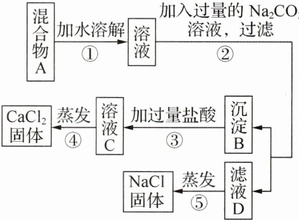 混合物 A→①加水溶解→溶液→②加入过量的 Na₂CO₃溶液,过滤→沉淀 B、滤液 D;滤液 D→⑤蒸发→NaCl 固体;沉淀 B→③加过量盐酸→溶液 C→④蒸发→CaCl₂固体