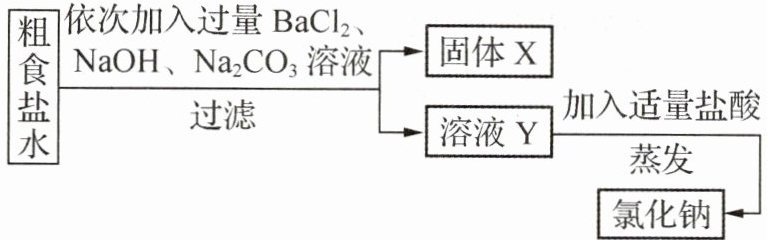 粗食盐水→依次加入过量 BaCl₂、NaOH、Na₂CO₃溶液→过滤→固体 X、溶液 Y→溶液 Y 加入适量盐酸→蒸发→氯化钠