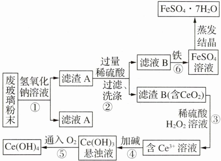 废玻璃粉末→①氢氧化钠溶液→滤渣 A、滤液 A;滤渣 A→②过量稀硫酸,过滤、洗涤→滤液 B、滤渣 B(含 CeO₂);滤液 B→铁→FeSO₄溶液→蒸发结晶→FeSO₄·7H₂O;滤渣 B(含 CeO₂)→③稀硫酸、H₂O₂溶液→含 Ce³+溶液→④加碱→Ce(OH)₃悬浊液→⑤通入 O₂→Ce(OH)₄