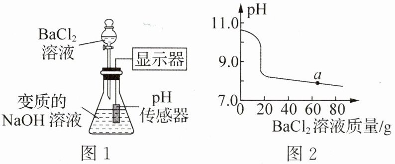 1. (2025·山东威海)图1是探究敞口放置的氢氧化钠溶液变质程度的装置,图2是实验过程中溶液pH随加入BaCl₂溶液质量变化情况(已知BaCl₂溶液显中性)。下列说法不正确的是(
