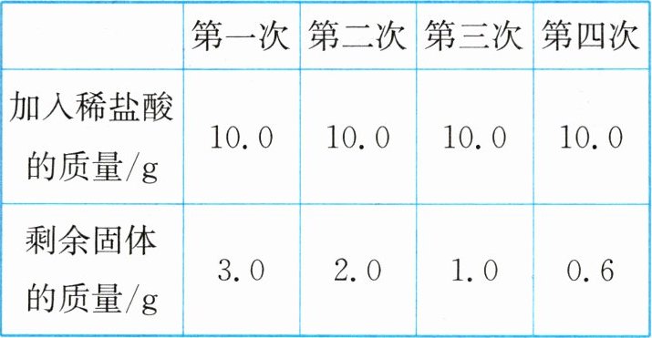 5. 为测定某瓶稀盐酸的溶质质量分数,取4.0g石灰石样品于烧杯中,将40.0g该稀盐酸分4次加入烧杯中,充分反应后经过滤、洗涤、干燥、称重,得实验数据如表所示。
