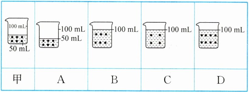 2. 建立模型是解决问题的一种方法。甲是50mL10%的蔗糖溶液,其中“·”表示所含的蔗糖分子。在该溶液中加入一定量的水,成为5%的蔗糖溶液。能表示稀释后蔗糖溶液模型的是(