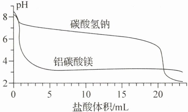 (4) 已知铝碳酸镁片是当今的主流抗酸药,为探究铝碳酸镁片相比碳酸氢钠片的优势,实验室用pH=1.5的稀盐酸模拟胃酸过多时的胃液。将上述稀盐酸以相同的滴速分别滴入等质量两种药粉的悬浊液中,测得pH随滴入盐酸体积的变化如图所示。结合图像分析,铝碳酸镁片作为抗酸药除了能将胃液的pH保持在3~5之间,以减少胃部不适外,还具有的优势为