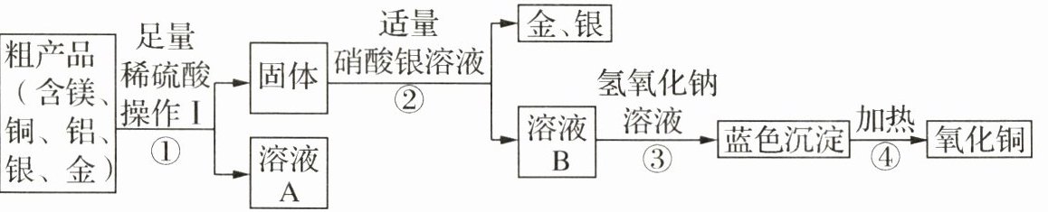 解析:(2)废旧电子粗产品中含镁、铝、铜、银、金,加入足量稀硫酸,镁与稀硫酸反应生成硫酸镁和氢气,铝与稀硫酸反应生成硫酸铝和氢气,铜、银、金与稀硫酸不反应,经过过滤,得到的溶液A中一定含有的金属离子是Mg²⁺和Al³⁺。(3)铜与硝酸银反应生成硝酸铜和银,则步骤③中是硝酸铜与氢氧化钠反应生成硝酸钠和氢氧化铜沉淀,该反应的化学方程式为Cu(NO₃)₂+2NaOH=Cu(OH)₂↓+2NaNO₃。(4)蓝色沉淀是硝酸铜与氢氧化钠反应生成的氢氧化铜沉淀,氢氧化铜在加热的条件下分解生成氧化铜和水,该反应的化学方程式为Cu(OH)₂$\xlongequal{△}$CuO+H₂O。(5)步骤①中是金属与酸的反应,属于置换反应,步骤②中是铜与硝酸银的反应,也属于置换反应,步骤③中是硝酸铜与氢氧化钠溶液的反应,属于复分解反应,步骤④中是氢氧化铜在加热条件下分解为氧化铜和水,属于分解反应,故没有涉及的基本反应类型是化合反应。