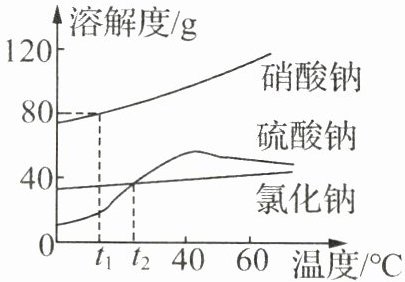 解析:(2) t₁℃时,硫酸钠的溶解度小于氯化钠的溶解度,则t₁℃时,等质量的硫酸钠和氯化钠的饱和溶液中溶剂质量的大小关系是硫酸钠溶液>氯化钠溶液;t₁℃时,将等质量的硫酸钠和氯化钠的饱和溶液升温至t₂℃(不考虑溶剂蒸发),溶解度增大,但溶液的组成没有发生改变,溶剂的质量不变,则溶剂质量的大小关系是硫酸钠溶液>氯化钠溶液。(3) t₁℃时,硝酸钠的溶解度为80g,t₁℃时,将60g硝酸钠(不含结晶水)加入50g水中,最多只能溶解40g,则充分溶解并恢复至原温度后,所得溶液中溶质的质量分数是$\frac{40\mathrm{g}}{40\mathrm{g}+50\mathrm{g}}×100\%\approx44.4\%$。(4) 没有指明溶液是否饱和,冷却热的硝酸钠溶液,不一定有晶体析出,故A错误;硝酸钠和氯化钠的溶解度受温度变化的影响不同,硝酸钠的溶解度受温度变化的影响较大,而氯化钠的溶解度受温度变化的影响较小,除去氯化钠溶液中的少量硝酸钠,可采用蒸发结晶法,故B错误;恒温蒸发溶剂,可将接近饱和的硫酸钠溶液变为饱和溶液,故C正确。
