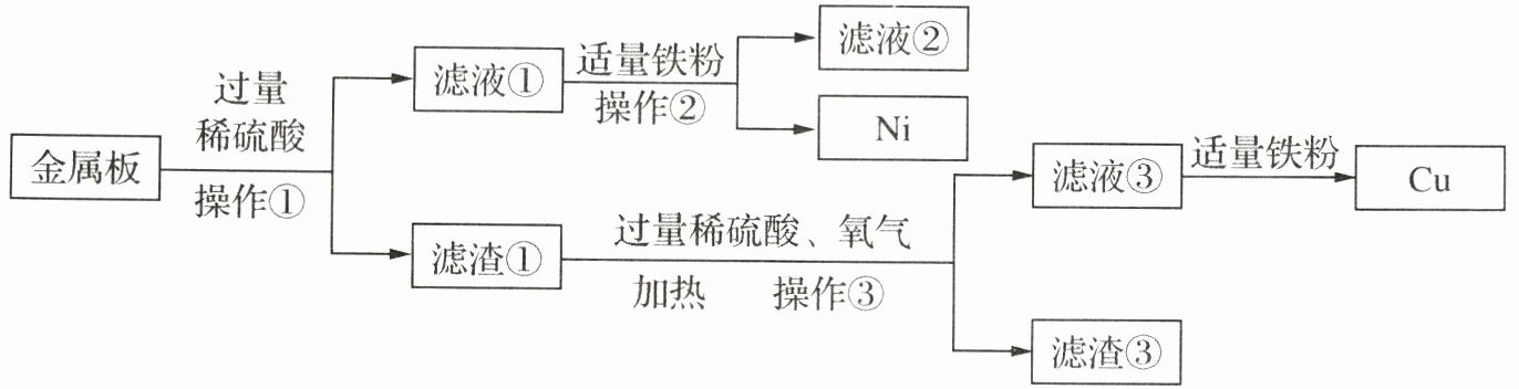 17. 亮点原创(8 分)垃圾是放错地方的资源,城市的废旧电器是一座“金属矿山”,某废旧电器中含有铁、铜、镍(Ni)三种金属,兴趣小组的同学为了从中回收金属铜和镍(已知镍在化合物中显+2 价,2Cu+O₂+2H₂SO₄ $\xlongequal{△}$ 2CuSO₄+2H₂O),做了如下探究。