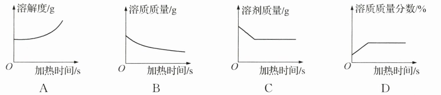 答案:8. D 解析:恒温蒸发一定质量的氯化钠不饱和溶液,溶解度不变,故A错误;恒温蒸发一定质量的氯化钠不饱和溶液,溶剂质量逐渐减小直至接近零,开始时没有氯化钠析出,溶质质量不变,故B、C错误;恒温蒸发一定质量的氯化钠不饱和溶液,溶剂质量逐渐减小,溶质质量分数不断增大,至溶液达到饱和状态,溶质质量分数不再变化,故D正确。