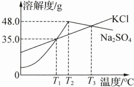 C.将等质量的KCl、Na₂SO₄饱和溶液从T₂℃降温到T₁℃,两溶液中溶质的质量相等