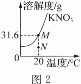 答案:13. A 解析:由题图2可知,20℃时,硝酸钾的溶解度为31.6g,由题图1可知,降温至20℃时,100g水中溶解了31.6g硝酸钾,此时析出10g硝酸钾晶体,说明一开始加入硝酸钾的质量为31.6g + 10g = 41.6g,故A正确;由题图1可知,降温一段时间后才析出晶体,说明该溶液一开始属于不饱和溶液,故B错误;将M点的溶液转化为N点是由饱和溶液变为同温度下的不饱和溶液,应加入溶剂,而不是蒸发溶剂,故C错误;20℃时,硝酸钾的溶解度为31.6g,说明20℃时,131.6g硝酸钾饱和溶液中含有31.6g硝酸钾,故D错误。