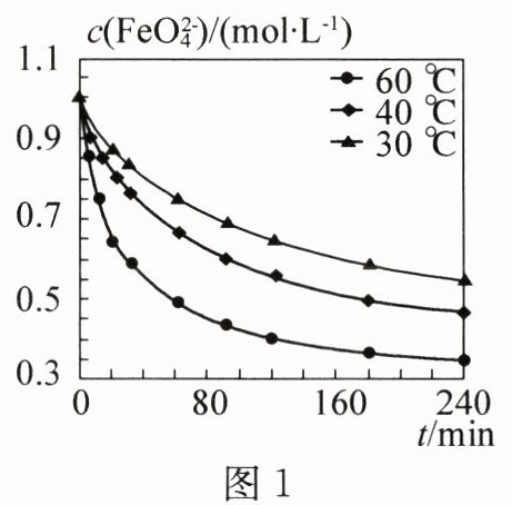 解析:(1)由流程图可知,“氧化”是将FeSO₄转化为Fe₂(SO₄)₃,反应物为硫酸亚铁、硫酸和过氧化氢,生成物为硫酸铁,根据质量守恒定律,化学反应前后原子的种类和数目都不变,则生成物中还应有水,则该反应的化学方程式为2FeSO₄+H₂SO₄+H₂O₂=2H₂O+Fe₂(SO₄)₃。(2)由题图可知,在30℃和pH=11.50时FeO₄²⁻的浓度最高,因此控制反应在30℃左右、碱性条件下进行时,Na₂FeO₄产率高,故B符合题意。(3)滤渣呈红褐色,符合氢氧化铁的外观状态,并且在含有铁离子的溶液中加入氢氧化钠,可以形成氢氧化铁沉淀,其化学式为Fe(OH)₃。(4)由物质的变化可知,反应物是Na₂FeO₄和氢氧化钾溶液,生成物是K₂FeO₄沉淀和氢氧化钠,该反应的化学方程式为Na₂FeO₄+2KOH=K₂FeO₄↓+2NaOH。