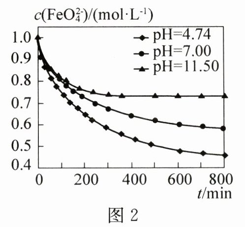 (2) 不同温度和pH下FeO₄²⁻在水溶液中的稳定性如图1、图2所示。图1、图2中纵坐标表示单位体积内FeO₄²⁻数目的多少,数值越小,表明FeO₄²⁻数目越少,在该条件下越不稳定。为了提高"合成"时Na₂FeO₄的产率,下列措施可行的是