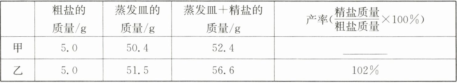 甲中可能是水太少,不能把氯化钠全部溶解,乙中可能是精盐没有蒸干