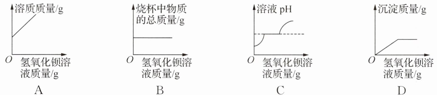 答案:4. C 解析:氢氧化钡和硫酸反应生成硫酸钡沉淀和水,氢氧化钡和硫酸铜反应生成硫酸钡沉淀和氢氧化铜沉淀,随着氢氧化钡的加入,生成的沉淀越来越多,溶液中的溶质会越来越少,恰好完全反应时溶质的质量为0,氢氧化钡过量后,溶液中的溶质会逐渐增多,图像与事实不相符,故 A 错误;此反应没有气体放出,随着氢氧化钡溶液的加入,烧杯中物质的总质量越来越大,图像与事实不相符,故B 错误;稀硫酸显酸性,$\mathrm{pH}<7$,随着氢氧化钡溶液的加入,烧杯中溶液的$\mathrm{pH}$会越来越大,硫酸恰好完全反应时溶液$\mathrm{pH}=7$,继续加入氢氧化钡,氢氧化钡与硫酸铜反应生成硫酸钡沉淀和氢氧化铜沉淀,溶液的$\mathrm{pH}$保持不变,当硫酸铜完全反应后,继续加入氢氧化钡溶液,溶液的碱性增强,$\mathrm{pH}>7$,图像变化与事实相符,故 C 正确;氢氧化钡先与硫酸反应生成硫酸钡沉淀,沉淀质量从0开始增加,当硫酸完全反应后,继续滴加氢氧化钡溶液,氢氧化钡与硫酸铜反应生成氢氧化铜沉淀和硫酸钡沉淀,沉淀质量增加的幅度比之前更大,最后沉淀的质量不再发生变化,图像与事实不相符,故 D 错误。