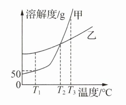 答案:3. D 解析:由题表数据可知,硝酸钾的溶解度受温度变化的影响较大,所以溶解度曲线中甲表示的是硝酸钾,乙表示的是硝酸钠。$T_{1}^{\circ}\mathrm{C}$时,甲的溶解度为50 g,所以$T_{1}^{\circ}\mathrm{C}$时,甲的饱和溶液中溶质的质量分数为$\frac{50\ \mathrm{g}}{50\ \mathrm{g}+100\ \mathrm{g}}×100\%\approx33.3\%$,故 A 错误;由题图可知,$T_{2}^{\circ}\mathrm{C}$时硝酸钠与硝酸钾的溶解度相等,由题表数据可知,$50^{\circ}\mathrm{C}$时,溶解度:硝酸钠>硝酸钾,$60^{\circ}\mathrm{C}$时,溶解度:硝酸钠>硝酸钾,则50~$60^{\circ}\mathrm{C}$时二者的溶解度不可能相等,故 B 错误;由题图可知,$T_{1}^{\circ}\mathrm{C}$时硝酸钾的溶解度比硝酸钠的小,所以$T_{1}^{\circ}\mathrm{C}$时饱和${NaNO3}$和${KNO3}$溶液的溶质质量分数:硝酸钠>硝酸钾,而二者的溶解度均随温度升高而增大,则将$T_{1}^{\circ}\mathrm{C}$时饱和${NaNO3}$和${KNO3}$溶液分别升温到$T_{2}^{\circ}\mathrm{C}$,二者均变为不饱和溶液,溶质和溶剂的质量都没有改变,则二者的溶质质量分数都不变,仍然是硝酸钠的溶质质量分数比硝酸钾的大,故 C 错误;由题图可知,$T_{3}^{\circ}\mathrm{C}$时硝酸钾的溶解度比硝酸钠的大,则$T_{3}^{\circ}\mathrm{C}$时等质量的${NaNO3}$、${KNO3}$饱和溶液中,溶质质量:硝酸钠<硝酸钾,溶剂质量:硝酸钠>硝酸钾,将$T_{3}^{\circ}\mathrm{C}$时等质量的${NaNO3}$、${KNO3}$饱和溶液分别降温到$T_{2}^{\circ}\mathrm{C}$,均有晶体析出,溶剂质量不变,则所得溶液中水的质量:硝酸钠>硝酸钾,故 D 正确。