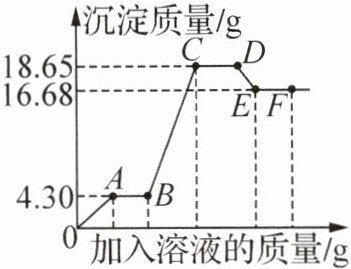 答案:5. C 解析:0→A 段是加入硝酸钡溶液,硫酸铵和碳酸钾会与硝酸钡反应生成硝酸铵和硫酸钡沉淀、硝酸钾和碳酸钡沉淀,A→B 段硫酸铵、碳酸钾反应完全,硝酸钡过量,则 B 点所得溶液中含有硝酸钡、硝酸铵、硝酸钾、氯化铵和水五种物质,故 A 错误;B→C 段加入的硝酸银溶液与氯化铵反应生成硝酸铵和氯化银沉淀,至 C 点恰好完全反应,C 点含有铵根离子、硝酸根离子、钾离子、钡离子四种离子,故 B 错误;D→E 段加入的稀硝酸会与碳酸钡反应生成硝酸钡、二氧化碳和水,而氯化银、硫酸钡与稀硝酸不反应,碳酸钡的质量为18.65 g-16.68 g=1.97 g,硫酸钡的质量为4.30 g-1.97 g=2.33 g,氯化银的质量为18.65 g-4.30 g=14.35 g,设样品中氯化铵的质量为$x$,硫酸铵的质量为$y$,碳酸钾的质量为$z$,