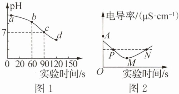 6.(2025·江苏镇江模拟·3分)溶液电导率越大,导电能力越强。在相同条件下,电导率与离子浓度(单位体积内的离子数)成正比。向含酚酞的氢氧化钡溶液中滴加稀盐酸,测得溶液pH变化和电导率变化如图1、图2所示。