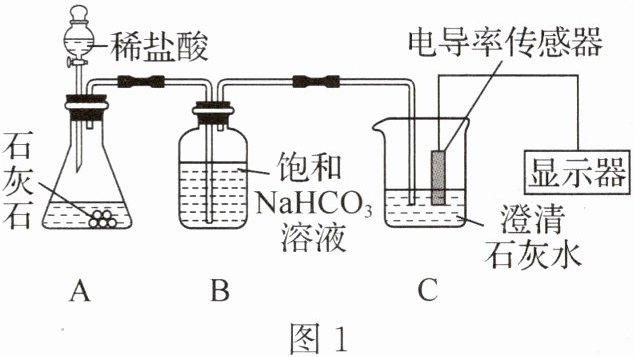 3-答案:12. D 解析:装置A可通过分液漏斗控制液体的滴加速率,从而控制反应速率,故A正确;石灰石的主要成分碳酸钙和稀盐酸反应生成氯化钙、二氧化碳和水,ab段电导率下降,是因为二氧化碳与氢氧化钙反应生成碳酸钙沉淀和水,澄清石灰水会变浑浊,故B正确;bc段电导率上升是因为碳酸钙与二氧化碳和水反应生成可溶性的碳酸氢钙,溶液中离子浓度增大,故C正确;初始时溶液是氢氧化钙溶液,溶液中存在Ca²⁺和OH⁻,bc段生成了Ca(HCO₃)₂,溶液中存在Ca²⁺和HCO₃⁻,溶液最终电导率的值低于初始值,说明OH⁻的导电能力强于HCO₃⁻,故D错误。