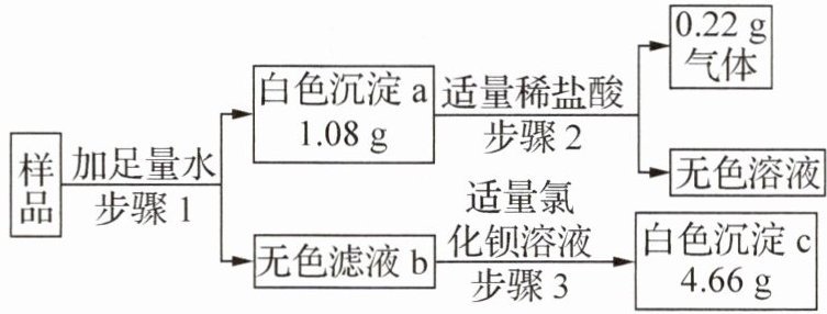 解析:取 7.0 g 样品进行实验(各步均恰好完全反应),向样品中加入足量水,得到 1.08 g 白色沉淀 a 和无色滤液 b,硝酸铜溶液呈蓝色,氢氧化铜是蓝色沉淀,则原固体中一定不含硝酸铜;向白色沉淀 a 中加入适量稀盐酸,得到 0.22 g 气体和无色溶液。碳酸钙和盐酸反应生成氯化钙、水和二氧化碳,反应的化学方程式及其质量关系如下: