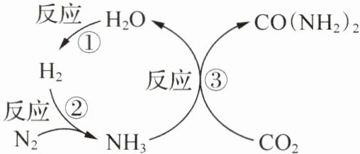 $ \frac{6}{34} = \frac{x}{3.4 \, \mathrm{t}} $ $ x = 0.6 \, \mathrm{t} $,故 A 正确;由反应③的化学方程式 $ 2\mathrm{NH}_3 + \mathrm{CO}_2 \xlongequal{\mathrm{一定条件}} \mathrm{CO}(\mathrm{NH}_2)_2 + \mathrm{H}_2\mathrm{O} $ 可知,参加反应的 $ \mathrm{NH}_3 $ 和 $ \mathrm{CO}_2 $ 的质量比为 $ (17 × 2) : 44 = 17 : 22 $,故 B 正确;由题图可知,总反应的化学方程式为 $ 2\mathrm{CO}_2 + 4\mathrm{H}_2\mathrm{O} + 2\mathrm{N}_2 \xlongequal{\mathrm{一定条件}} 3\mathrm{O}_2 + 2\mathrm{CO}(\mathrm{NH}_2)_2 $,可知该转化流程中,需要不断补充 $ \mathrm{H}_2\mathrm{O} $,故 C 错误;由总反应的化学方程式可知,反应前分子总数大于反应后分子总数,则该转化流程中,分子总数减少,故 D 正确。