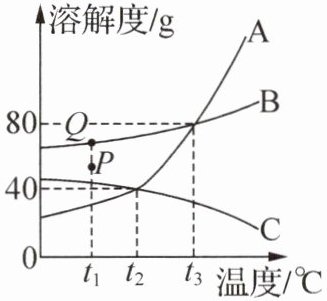 解析:(4) $ t_3^{\circ}\mathrm{C} $ 时,溶解度大小关系为 $ A = B > C $,等质量的饱和溶液中,溶解度越小,溶剂(水)的质量越大,所以等质量的 A、B、C 三种物质的饱和溶液中,含水的质量最大的是 C。(5) 虽然 A、B 的溶解度都随温度降低而减小,但没有指明 A、B 饱和溶液的质量是否相等。溶液质量不等,从 $ t_3^{\circ}\mathrm{C} $ 降温至 $ t_1^{\circ}\mathrm{C} $,析出晶体的质量就无法确定。