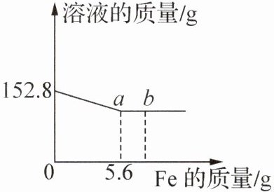 传统文化 (2024·黑龙江牡丹江·5分) “信州铅山县有苦泉,流以为涧。挹其水熬之,则成胆矾,烹胆矾则成铜。熬胆矾铁釜,久之亦化为铜”。——沈括《梦溪笔谈》。兴趣小组根据其中的原理进行了如下实验。向 152.8 g 硫酸铜溶液中加入铁粉,所得实验数据如图所示(已知:$ \mathrm{Fe} + \mathrm{CuSO}_4 = \mathrm{FeSO}_4 + \mathrm{Cu} $)。