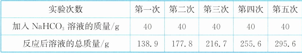 答案:13. 解:(1)由题表中数据可知,第一次实验时,40g碳酸氢钠溶液完全反应生成二氧化碳气体的质量为100g+40g−138.9g=1.1g,设第一次实验时,所加NaHCO₃溶液中溶质的质量为x。