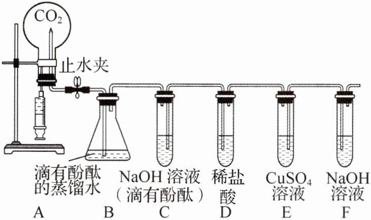 【思路分析】用注射器缓缓注入$3\ \mathrm{mL}\ {NaOH}$溶液,轻轻振荡烧瓶,打开止水夹,氢氧化钠与二氧化碳反应,装置内气体减少,瓶内压强减小,B 中蒸馏水进入圆底烧瓶 A 中形成喷泉;D 中稀盐酸倒吸入 C 中,C 中发生的反应是氢氧化钠和盐酸反应生成氯化钠和水,实验现象为溶液由红色变成无色;“连锁反应”后,F 中的氢氧化钠溶液进入 E 中,氢氧化钠和硫酸铜反应生成蓝色沉淀氢氧化铜和硫酸钠。碳酸钠和氢氧化钠溶液均显碱性,都能使酚酞溶液变红,则不能判断烧瓶内一定有氢氧化钠剩余。