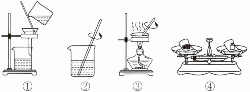 答案:3. A 解析:操作①中若有液体溅出,会造成最终得到的氯化钠质量偏小,使精盐产率偏低,故 A 错误;操作③的名称是蒸发,当蒸发皿中出现较多固体时,停止加热,利用蒸发皿的余热将剩余水分蒸干,故 B 正确;操作②为溶解,过程中玻璃棒的作用是搅拌,加速溶解,故 C 正确;粗盐提纯的顺序为称量粗盐质量、溶解、过滤、蒸发、称量精盐质量、计算产率,则正确顺序为④②①③④,故 D 正确。