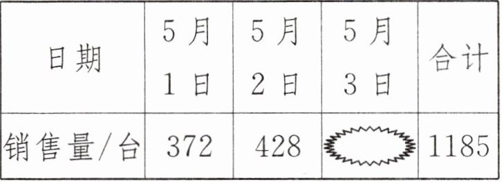 答案:3. 385 【提示】总销售量 - 5 月 1 日的销售量 - 5 月 2 日的销售量 = 5 月 3 日的销售量,列式为 1185 - 372 - 428 = 385(台)。