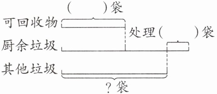 【提示】可回收物的袋数 $ × 2 = $ 厨余垃圾的袋数,厨余垃圾的袋数 $ - 12 = $ 其他垃圾的袋数。