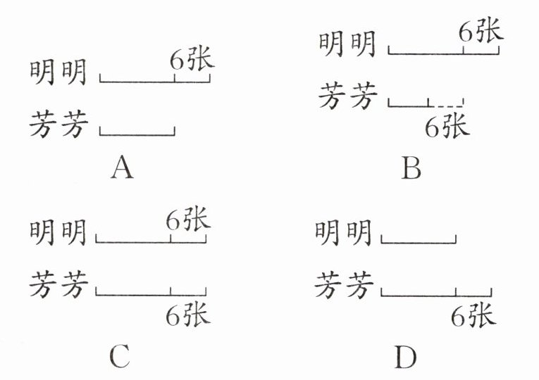 答案:4. B 【提示】明明给芳芳 6 张树叶画后两人的树叶画一样多,说明明明比芳芳多$6+6=12$(张),只有选项 B 符合题意。