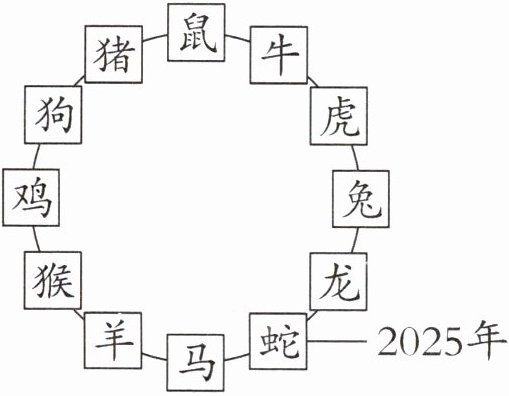 3. 传统文化 十二生肖 十二生肖又称属相,对应十二种动物,是一种历史悠久的文化符号。我国农历用鼠、牛、虎、兔、龙、蛇、马、羊、猴、鸡、狗、猪这 12 种动物按顺序轮流表示属相。2025 年是蛇年,张老师是 1990 年出生的,请你推算一下张老师是什么属相?