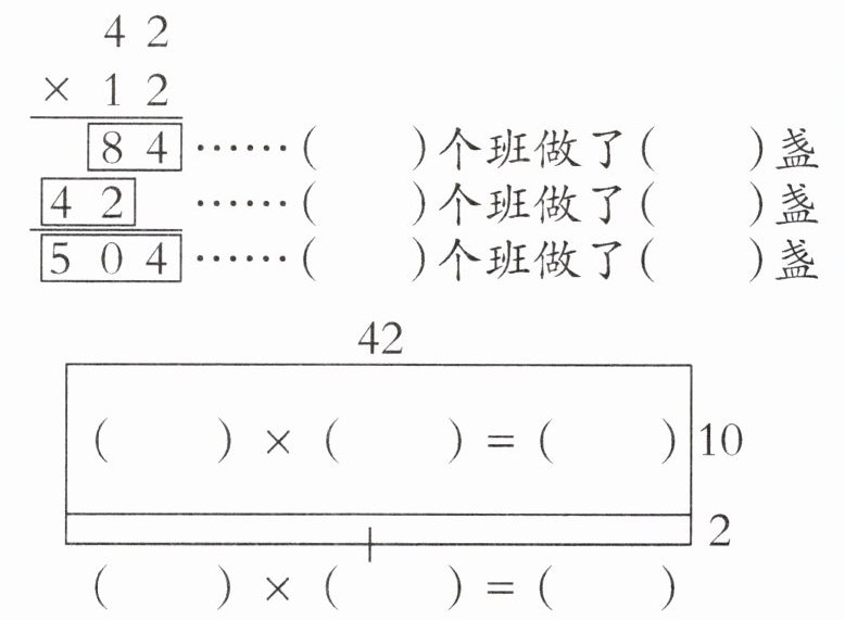 1. 对于求“每个班做 42 盏花灯,12 个班做多少盏?”这个问题,小明列出了如下的竖式,在括号里填合适的数,并在长方形图中标出每一步运算。