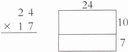 答案:4. 408 24×10=240 24×7=168 【提示】上面长方形表示第一个乘数 24 与第二个乘数十位上的数“1”(即 10)的积,算式为 24×10=240;下面长方形表示第一个乘数 24 与第二个乘数个位上的数“7”的积,算式为 24×7=168。