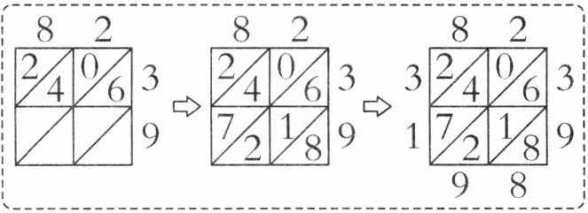 [提示]根据“铺地锦”的计算方法,通过分析图形中数字的计算规则来确定各个值。