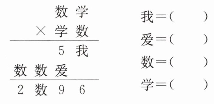 答案:5. 6 4 2 8 【提示】由得数的个位上是 6 可知,“我”代表 6,5+4=9,即“爱”代表 4,此时看积的百位和千位,可知“数”代表 2。3×2=6,但23×32 的积不是四位数,不满足,则只能是8×2=16,所以“学”代表 8。经检验,算式是28×82=2296。
