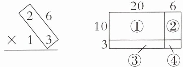 (1)朵朵在计算“26×13”时,画了右下的长方形图,和左边竖式中框出部分对应的小长方形是(