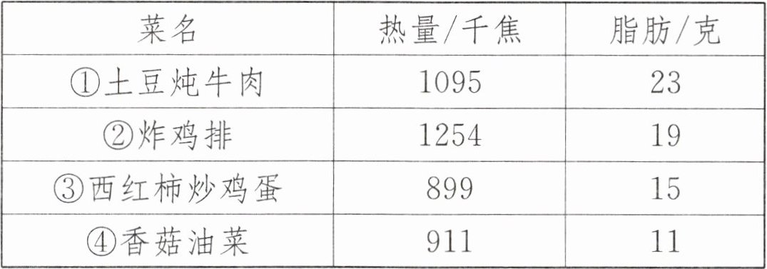 答案:1. B 【提示】妈妈推荐的菜肴的总热量为 $ 1095 + 1254 + 899 = 3248 $(千焦),$ 3248 > 2926 $,热量符合标准;妈妈推荐的菜肴的脂肪总含量为 $ 23 + 19 + 15 = 57 $(克),$ 57 > 50 $,脂肪含量不符合标准。爸爸推荐的菜肴的总热量为 $ 1254 + 899 + 911 = 3064 $(千焦),$ 3064 > 2926 $,热量符合标准;爸爸推荐的菜肴的脂肪总含量为 $ 19 + 15 + 11 = 45 $(克),$ 45 < 50 $,脂肪含量符合标准。因此爸爸推荐的菜肴符合营养标准。