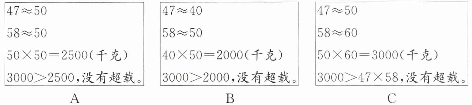 答案:5. C 【提示】选项 C 将 47 估为 50,58 估为 60(均往大估),得到 $ 50 × 60 = 3000 $,此估算确保实际值小于卡车的载质量,方法最恰当。