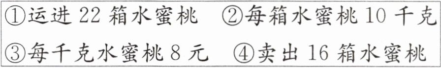答案:7. (1)②③④ 【提示】要求已经卖出的水蜜桃可以收入多少元,需要知道卖出水蜜桃的质量以及每千克水蜜桃的价格,而要求卖出水蜜桃的质量需要知道每箱水蜜桃的质量和卖出的箱数,因此需要用到的信息是②③④。