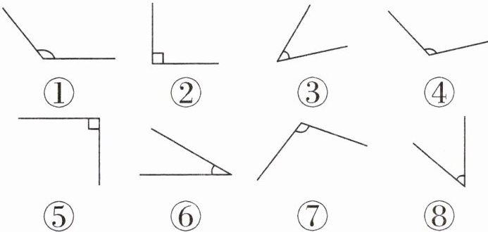 【提示】用三角板上的直角去比,钝角比直角大,锐角比直角小,据此对图中的角进行分类判断。