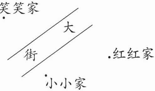6. 新情境 乡村建设 聚焦乡村建设,打造美丽宜居新典范。在“美丽乡村建设”活动中,为了保证家家户户都通上自来水,大街的两边设置了自来水管道,小小、红红、笑笑家分别住在大街两边新建的房子里,每家的水管怎样接最合适?请在图上画出来。