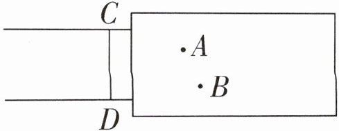 7. 下图是小玲跳远后的示意图。线段 $ CD $ 是起跳线,点 $ A $ 是左脚的落点,点 $ B $ 是右脚的落点。如果用尺子量小玲跳远的成绩,那么尺子应该怎么放?请画出示意图。