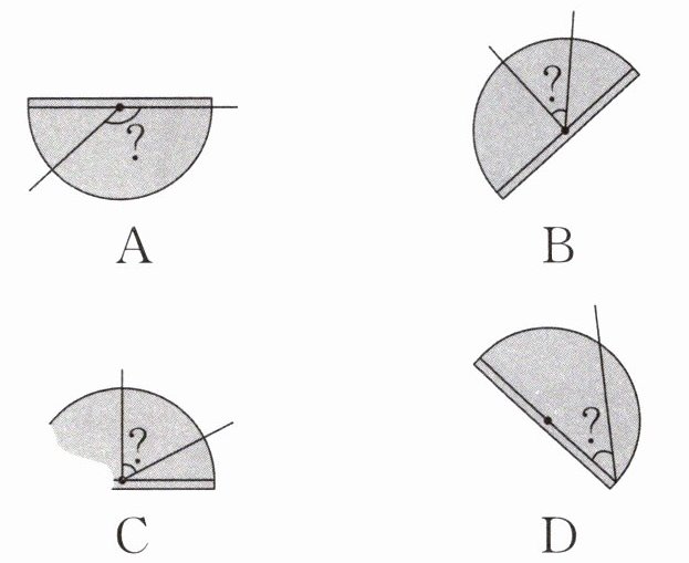 答案:(2)D 【提示】由题图可知,角的一条边对应量角器外圈的 30°刻度线,另一条边被挡住,但根据量角器的刻度分布,这个角的度数一定小于或等于 180° - 30° = 150°,因此从图中露出部分判断,这个角不可能是 170°。