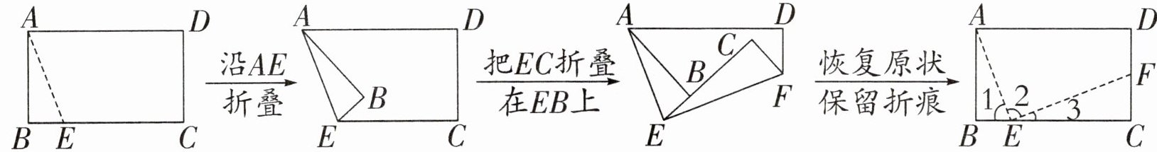 【提示】如下图所示,把长方形纸片沿 AE 折叠后,$∠1$和$∠4$折叠前后对应角相等;再把 EC 向上折叠后,$∠3$和$∠5$折叠前后对应角相等。因为$∠1$、$∠4$、$∠5$、$∠3$组成一个平角,平角为$180^{\circ }$,且由折叠性质可知$∠1=∠4$,$∠3=∠5$,所以$∠2=∠4+∠5=180^{\circ }÷ 2=90^{\circ }$。
