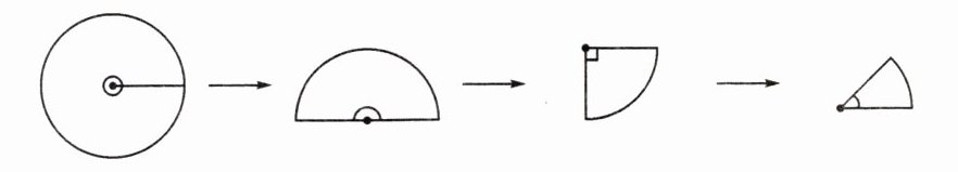 1. 折纸艺术起源于中国,折纸不仅具有极高的艺术性,还可以启发人们的创造力和逻辑思维能力,促进手脑的协调。在一次社团活动中,折纸社团成员芳芳将一张圆形纸片按下面的方式对折三次,让其他社团成员猜一猜对折后的角各是什么角?分别是多少度?请填一填吧。